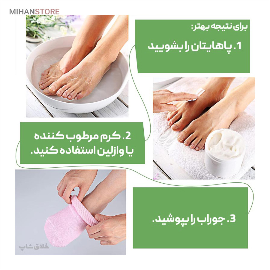 همان طور که اشاره شده استفاده بسیار آسانی دارد ابتدا پاهای خود را با مقداری  آب ولرم بشویید تا کاملا تمیز شود و بعد و ان را به وسیله یک حوله یا دستمال خشک نمایید و از هر کرمی که دوست دارید استفاده کنید و روی پاهای خود بمالید و بعد جوراب را بپوشید و معمولا 20 دقیقه طول میکشد تا کرم جذب پای شما شود.